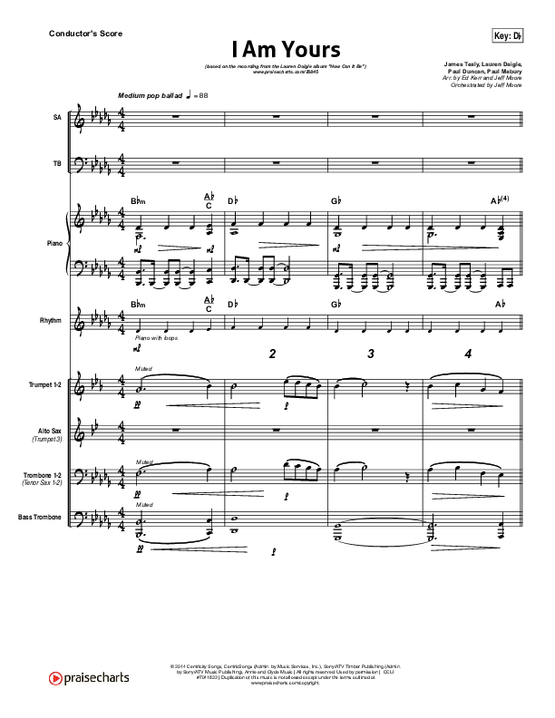 Download the Orchestration for I Am Yours by Lauren Daigle, from the album How Can It Be. This song was arranged by Ed Kerr / Jeff Moore in the key of D, Db.