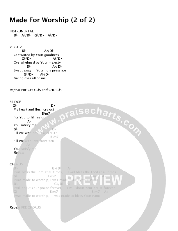 Download the PDF Chord Charts for Made For Worship by Planetshakers, from the album Outback Worship Sessions. This song was arranged by Integrity Music in the key of Db.