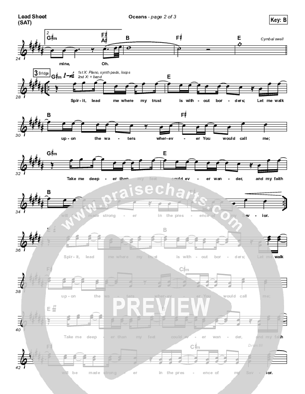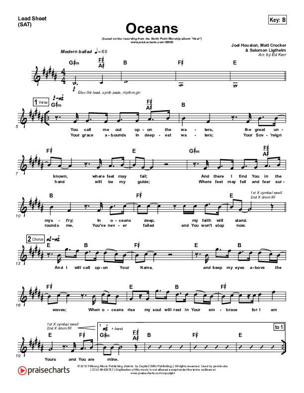 Download the sheet music for Oceans (Where Feet May Fail) by Adam Kersh / North Point Worship, from the album Hear. This song was arranged by Ed Kerr in the key of B.