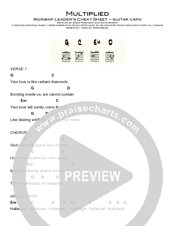 Download the PDF Chord Charts for Multiplied by Steve Fee / North Point Worship, from the album Hear. This song was arranged by Daniel Galbraith in the key of F, G.