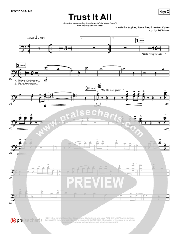 Download the Trombone 1,2 sheet music for Trust It All by Brett Stanfill / North Point Worship, from the album Hear. This song was arranged by Jeff Moore in the key of Bb, C.