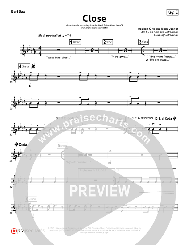 Download the Bari Sax sheet music for Close by Lauren Daigle / North Point Worship, from the album Hear. This song was arranged by Jeff Moore / Ed Kerr in the key of E, F.