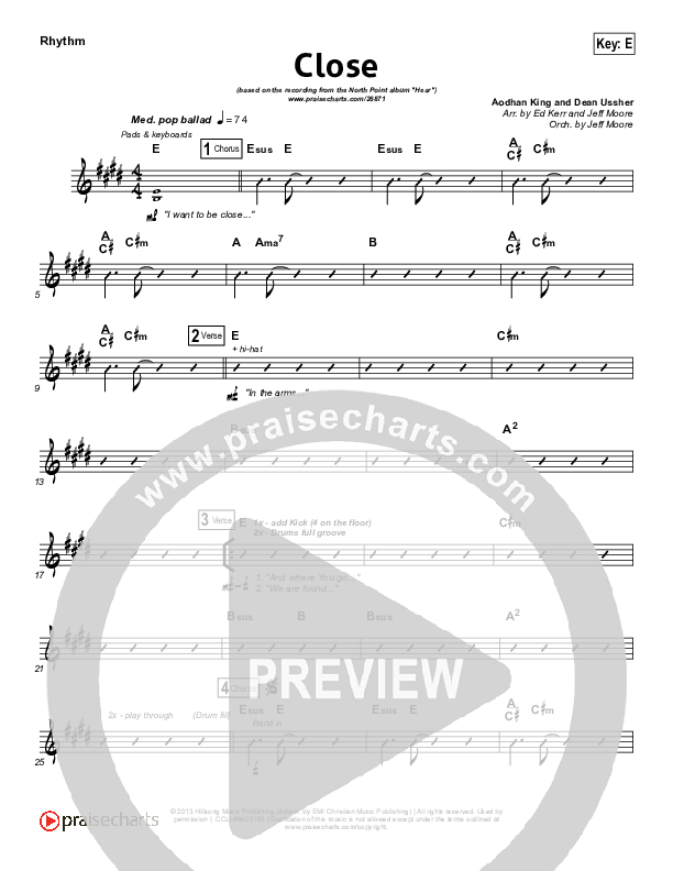 Download the Rhythm Chart for Close by Lauren Daigle / North Point Worship, from the album Hear. This song was arranged by Jeff Moore / Ed Kerr in the key of E, F.