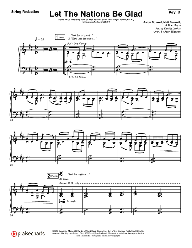 Download the Orchestration for Let The Nations Be Glad by Matt Boswell, from the album Messenger Hymns (Vol 1). This song was arranged by Dustin Loehrs / John Wasson in the key of D, Eb.
