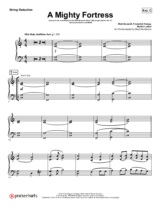 Download the Orchestration for A Mighty Fortress Is Our God by Matt Boswell, from the album Messenger Hymns (Vol 2). This song was arranged by Brad Henderson in the key of Bb, C.
