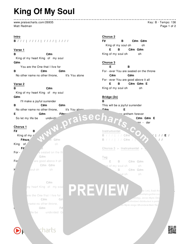 Download the PDF Chord Charts for King Of My Soul by Matt Redman, from the album Unbroken Praise. This song was arranged by Jeff Moore in the key of B, C.