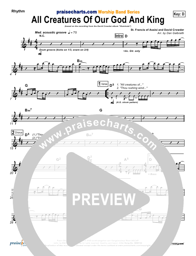 Download the Rhythm Chart for All Creatures Of Our God And King by David Crowder, from the album Illuminate. This song was arranged by Daniel Galbraith in the key of C, D.