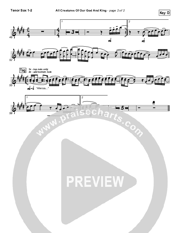 Download the Tenor Sax sheet music for All Creatures Of Our God And King by David Crowder, from the album Illuminate. This song was arranged by Daniel Galbraith in the key of C, D.
