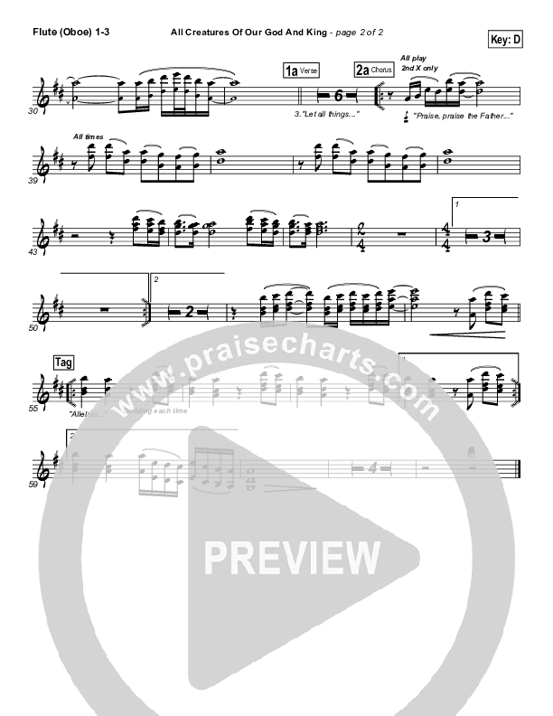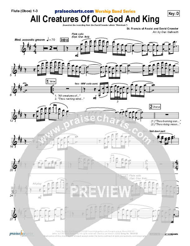 Download the Orchestration wind parts for All Creatures Of Our God And King by David Crowder, from the album Illuminate. This song was arranged by Daniel Galbraith in the key of C, D.