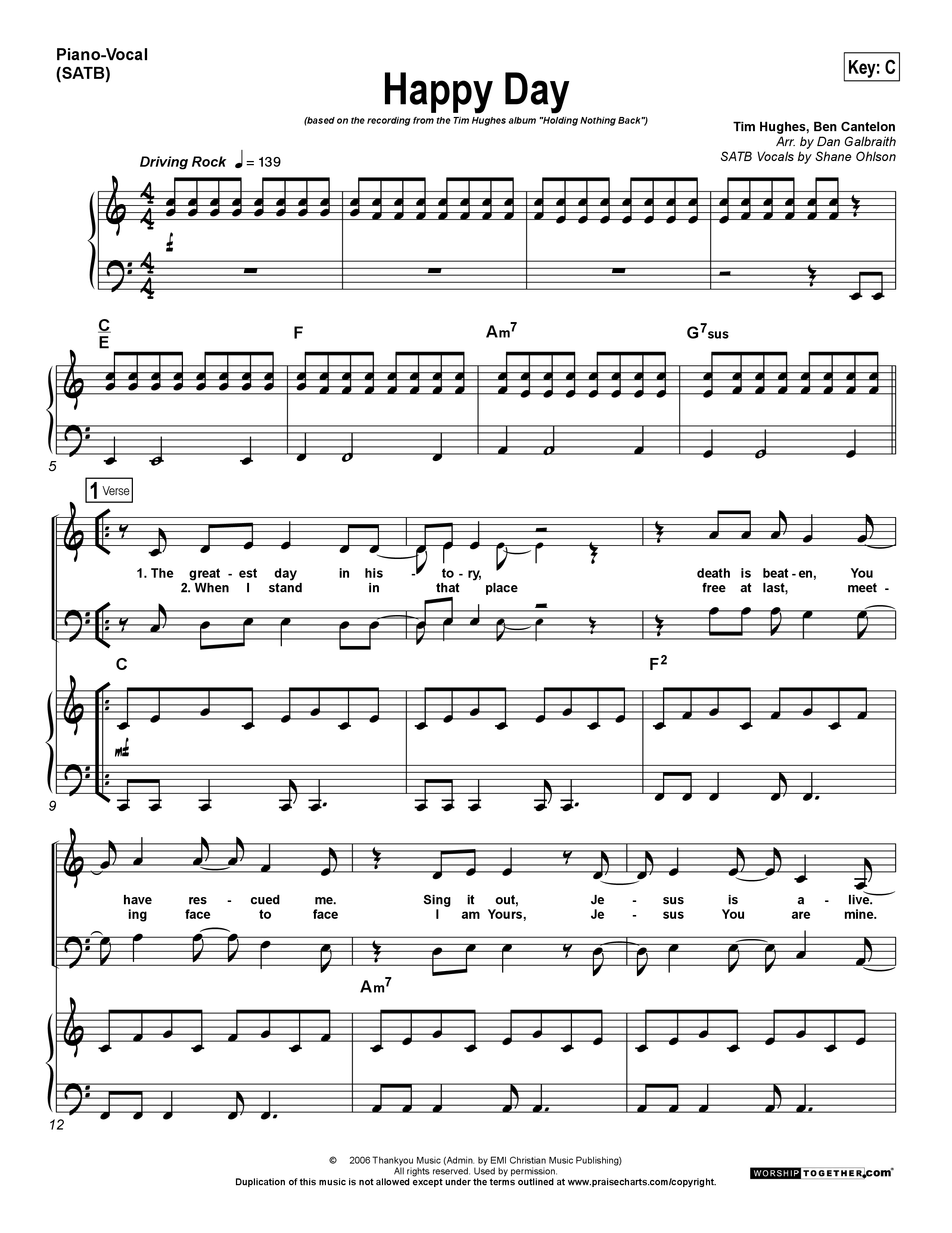 Download the sheet music for Happy Day by Tim Hughes, from the album Holding Nothing Back. This song was arranged by Daniel Galbraith in the key of A, Bb, C.