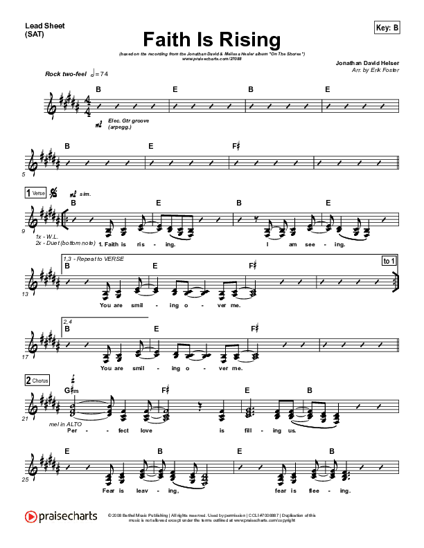 Download the sheet music for Faith Is Rising by Jonathan David Helser / Melissa Helser, from the album On The Shores. This song was arranged by Erik Foster in the key of A, B.
