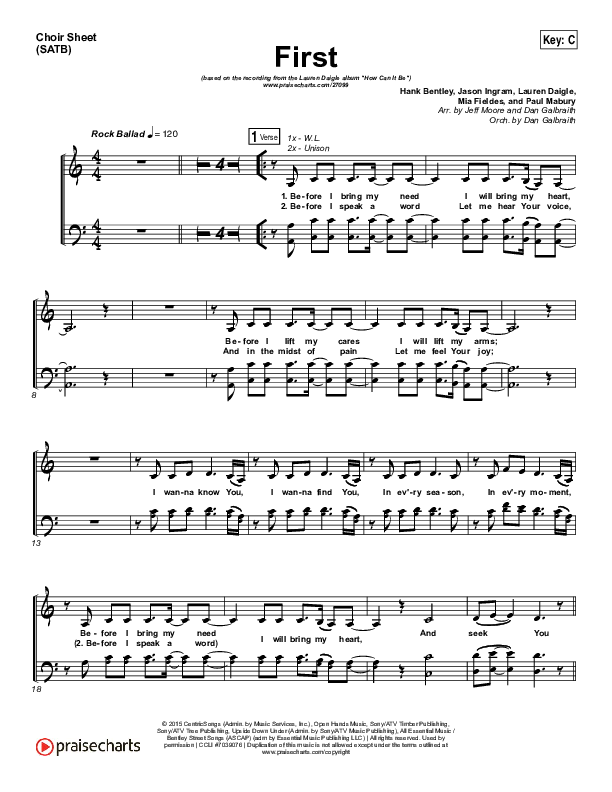 Download the Choir Sheet for First by Lauren Daigle, from the album How Can It Be. This song was arranged by Jeff Moore / Daniel Galbraith in the key of A, C, D.