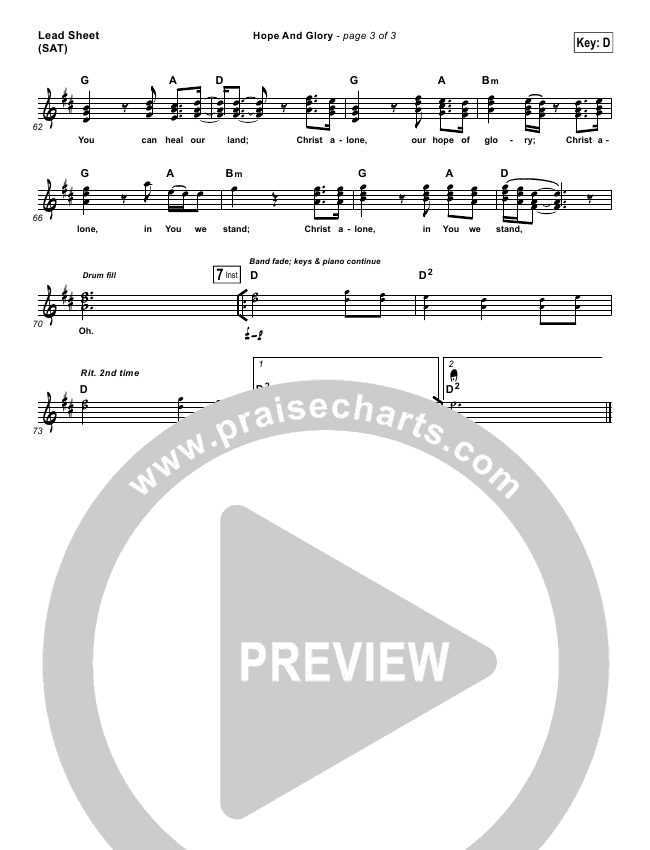 Download the sheet music for Hope And Glory by Tim Hughes, from the album Pocketful Of Faith. This song was arranged by Ed Kerr in the key of C, D.