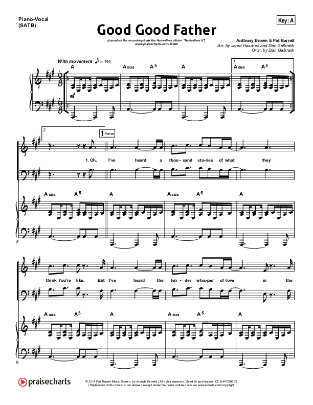 Download the sheet music for Good Good Father by Housefires, from the album Housefires ll. This song was arranged by Jared Haschek / Daniel Galbraith in the key of A, Ab, B, Bb, C, G.