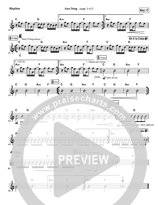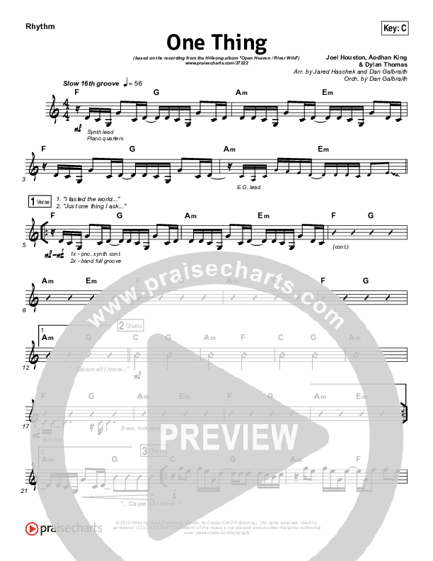 Download the Rhythm Chart for One Thing by Hillsong Worship, from the album Open Heaven / River Wild. This song was arranged by Jared Haschek / Daniel Galbraith in the key of A, B, Bb, C.