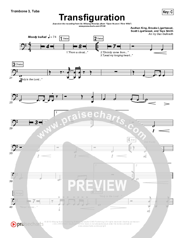 Download the Trombone 3/Tuba sheet music for Transfiguration by Hillsong Worship, from the album Open Heaven / River Wild. This song was arranged by Daniel Galbraith in the key of C, D.