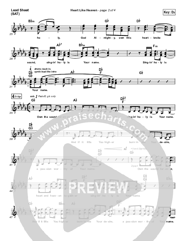 Download the sheet music for Heart Like Heaven by Hillsong Worship, from the album Open Heaven / River Wild. This song was arranged by Shane Ohlson in the key of Bb, Db.