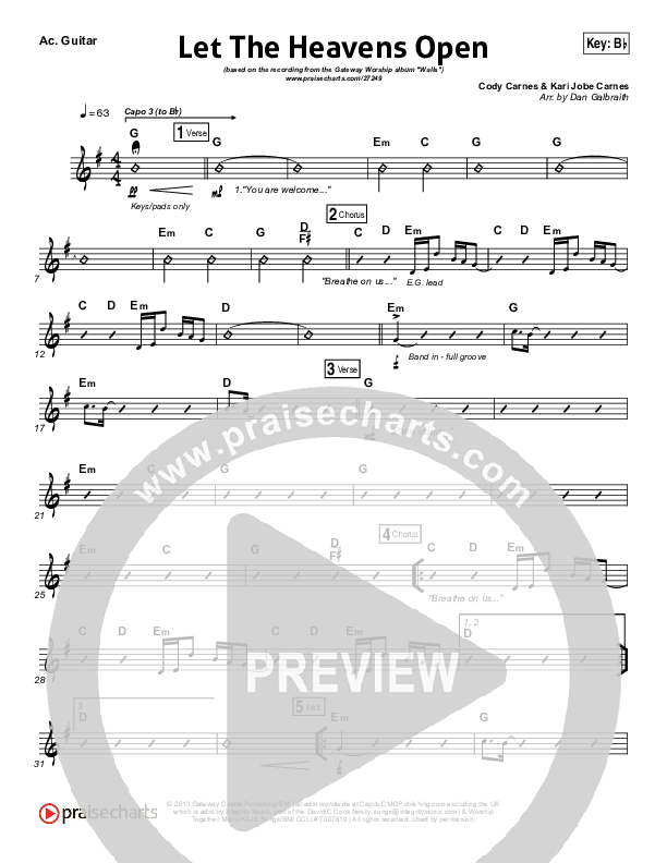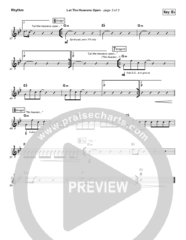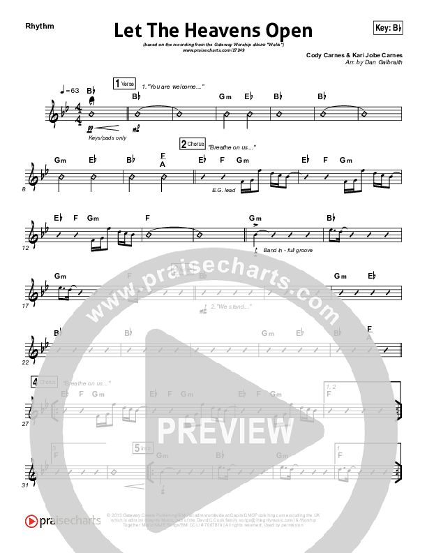 Download the Rhythm Chart for Let The Heavens Open by Gateway Worship / Kari Jobe, from the album Walls. This song was arranged by Daniel Galbraith in the key of Bb, C.