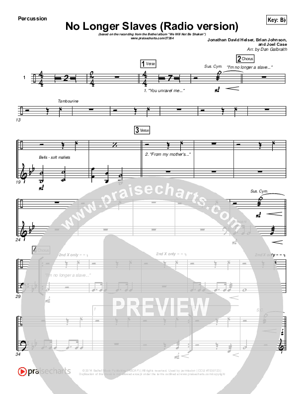 Download the percussion sheet music for No Longer Slaves (Radio) by Bethel Music / Jonathan David Helser, from the album We Will Not Be Shaken. This song was arranged by Daniel Galbraith in the key of A, Ab, B, Bb, C, G.