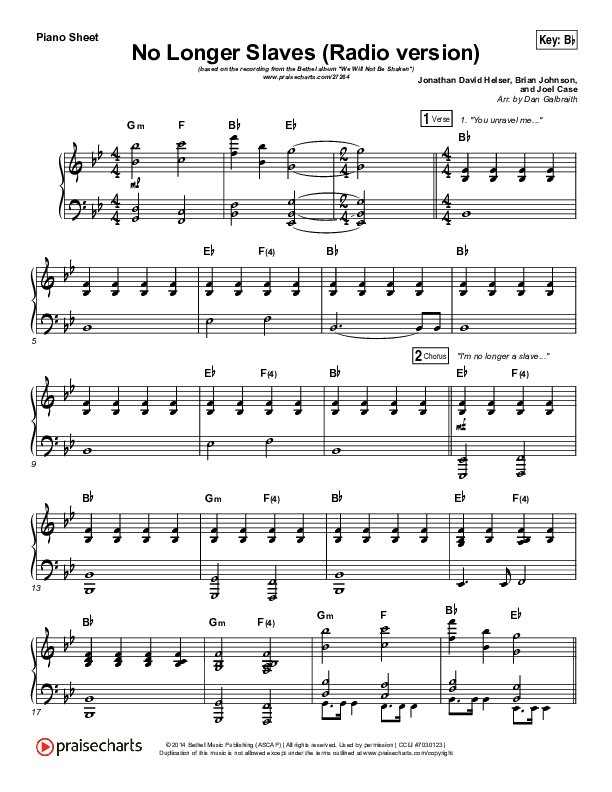 Download the piano sheet for No Longer Slaves (Radio) by Bethel Music / Jonathan David Helser, from the album We Will Not Be Shaken. This song was arranged by Daniel Galbraith in the key of A, Ab, B, Bb, C, G.