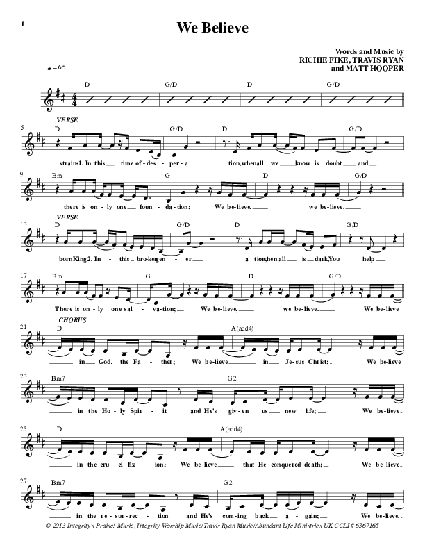 Download the sheet music for We Believe by Travis Ryan, from the album You Hold It All. This song was arranged by Integrity Music in the key of D.
