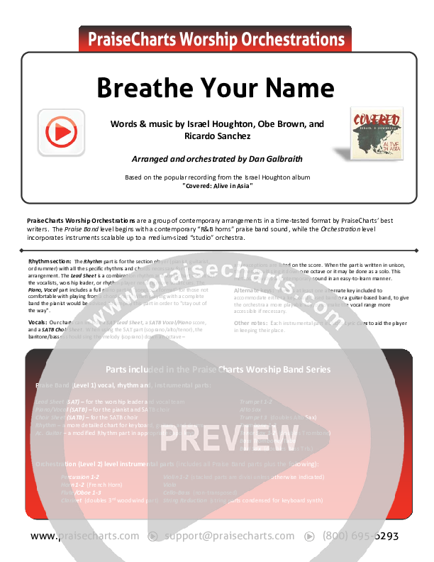 Download the Orchestration for Breathe Your Name by Israel Houghton, from the album Covered: Alive in Asia. This song was arranged by Daniel Galbraith in the key of C, D.