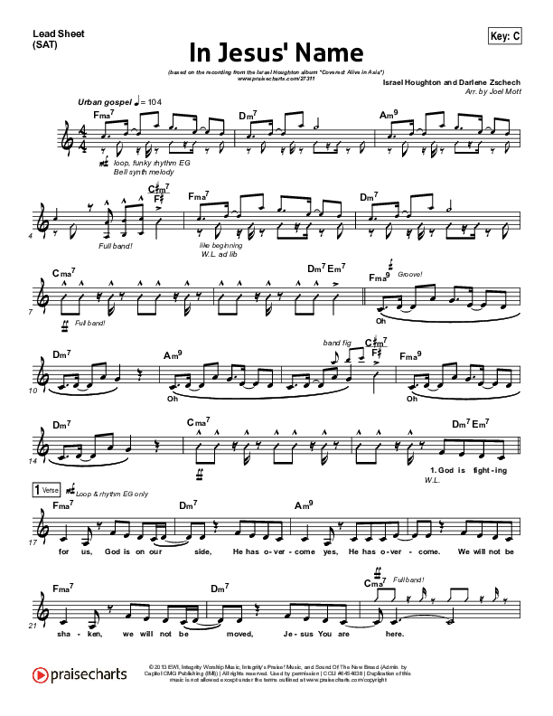Download the sheet music for In Jesus' Name by Israel Houghton, from the album Covered: Alive in Asia. This song was arranged by Joel Mott in the key of Bb, C.
