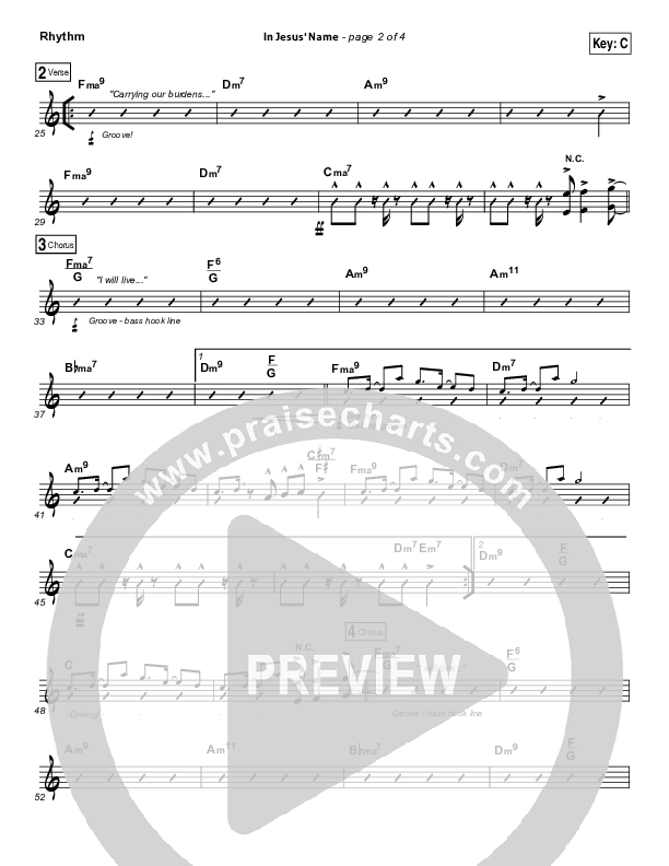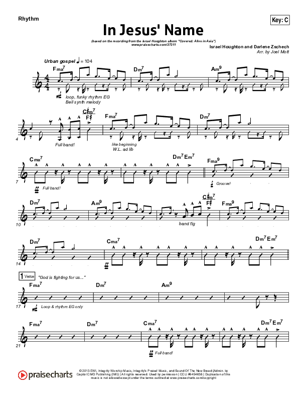 Download the Rhythm Chart for In Jesus' Name by Israel Houghton, from the album Covered: Alive in Asia. This song was arranged by Joel Mott in the key of Bb, C.