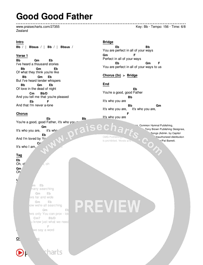 Verse 1 I've heard a thousand stories of what they think you're like But I've heard tender whispers of love in the dead of night And you tell me that you're pleased and that I'm never a-lone Chorus You're a good, good Father, it's who you are It's who you are, it's who you are And I'm loved by You, it's who I am It's who I am, it's who I am Tag Oh, oh, oh. Oh, oh, oh Oh, oh, oh. Oh Verse 2 I've seen many searching for answers far and wide But I know we're all searching for answers only You can provide 'Cause you know just what we need before we, we say a word Bridge You are perfect in all of your ways, perfect in all of your ways You are perfect in all of your ways to us End You're a good, good Father, it's who you are, It's who you are, it's who you are, it's who you are...