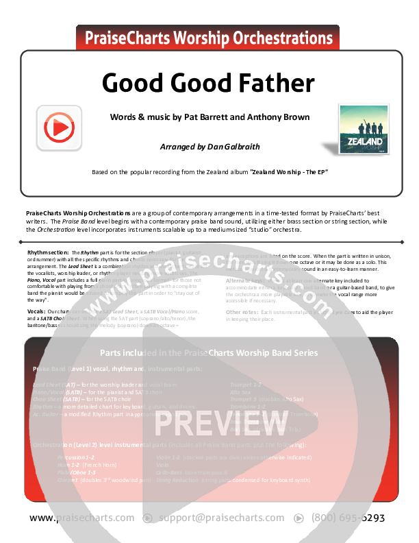 Download the Orchestration for Good Good Father by Zealand, from the album Zealand Worship - The EP. This song was arranged by Daniel Galbraith in the key of A, Bb.