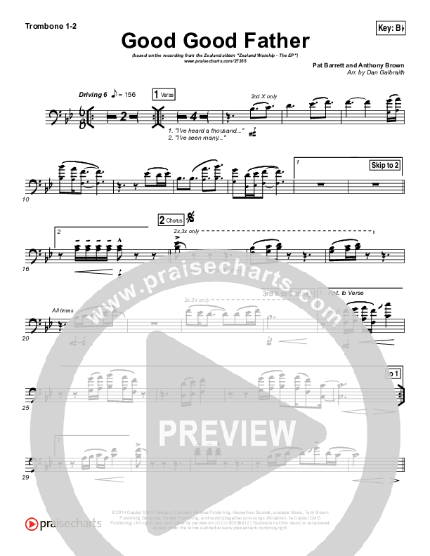 Download the Trombone 1,2 sheet music for Good Good Father by Zealand, from the album Zealand Worship - The EP. This song was arranged by Daniel Galbraith in the key of A, Bb.