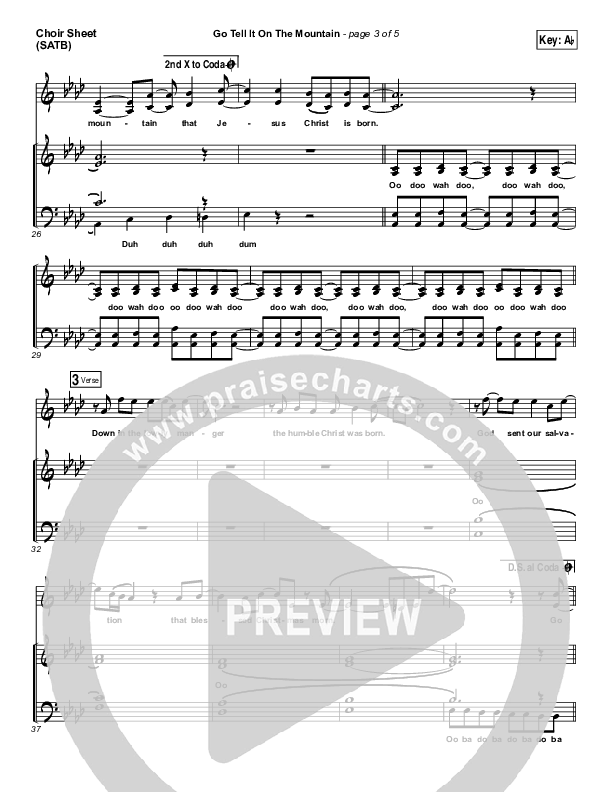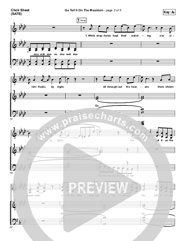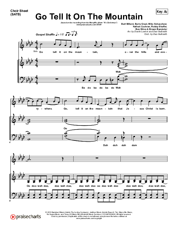 Download the Choir Sheet for Go Tell It On The Mountain by MercyMe, from the album It's Christmas. This song was arranged by Dustin Loehrs / Daniel Galbraith in the key of Ab, G.