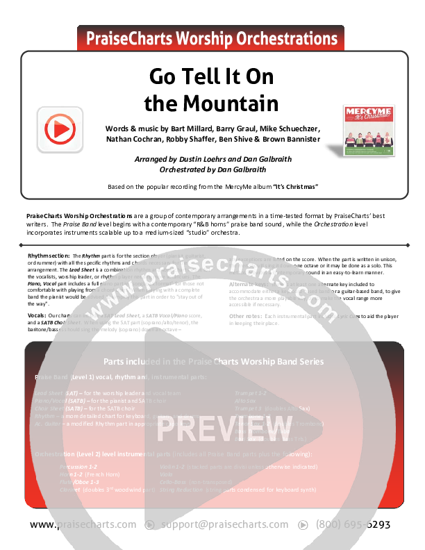 Download the Orchestration for Go Tell It On The Mountain by MercyMe, from the album It's Christmas. This song was arranged by Dustin Loehrs / Daniel Galbraith in the key of Ab, G.