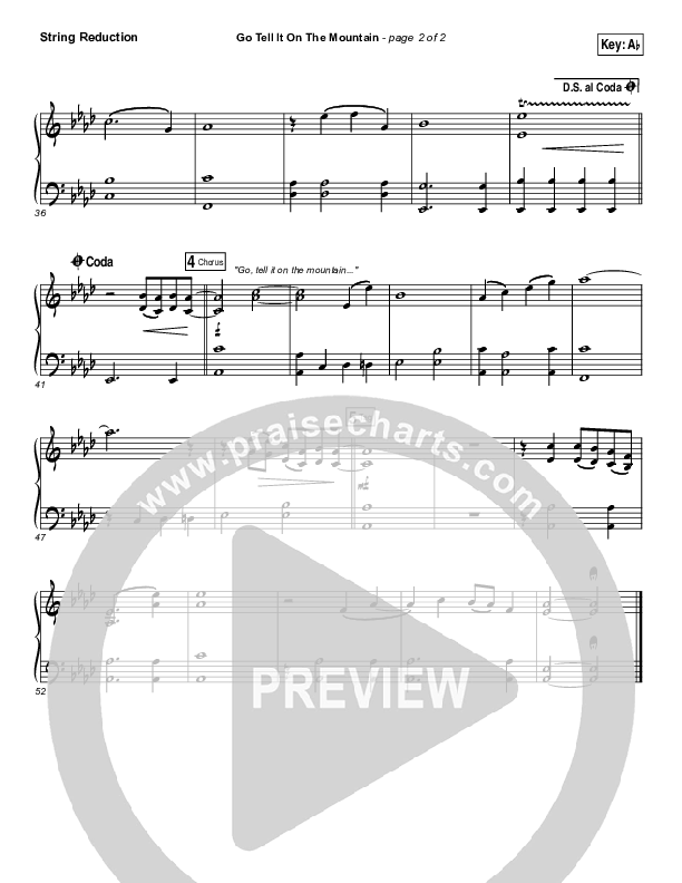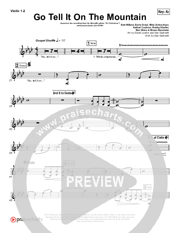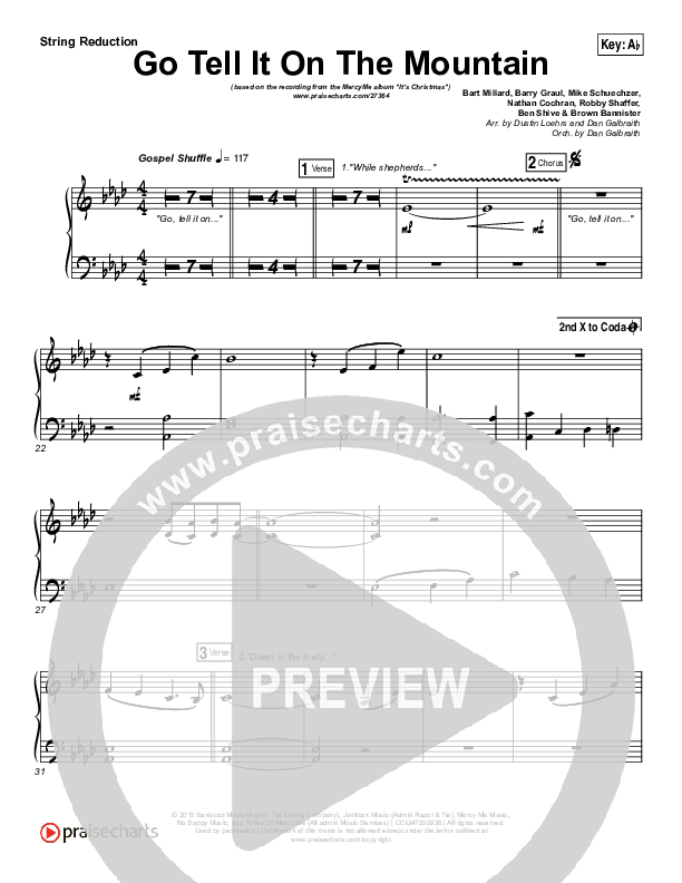 Download the Orchestration string parts for Go Tell It On The Mountain by MercyMe, from the album It's Christmas. This song was arranged by Dustin Loehrs / Daniel Galbraith in the key of Ab, G.