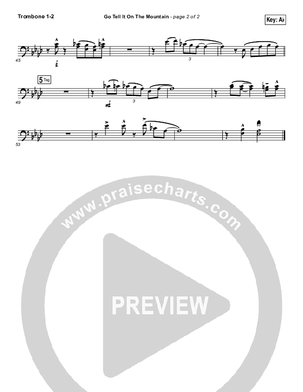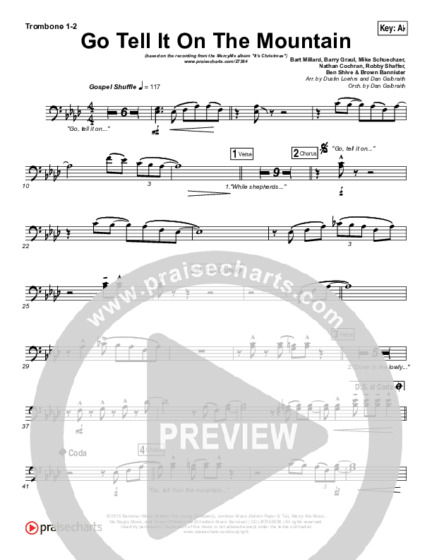 Download the Trombone 1,2 sheet music for Go Tell It On The Mountain by MercyMe, from the album It's Christmas. This song was arranged by Dustin Loehrs / Daniel Galbraith in the key of Ab, G.