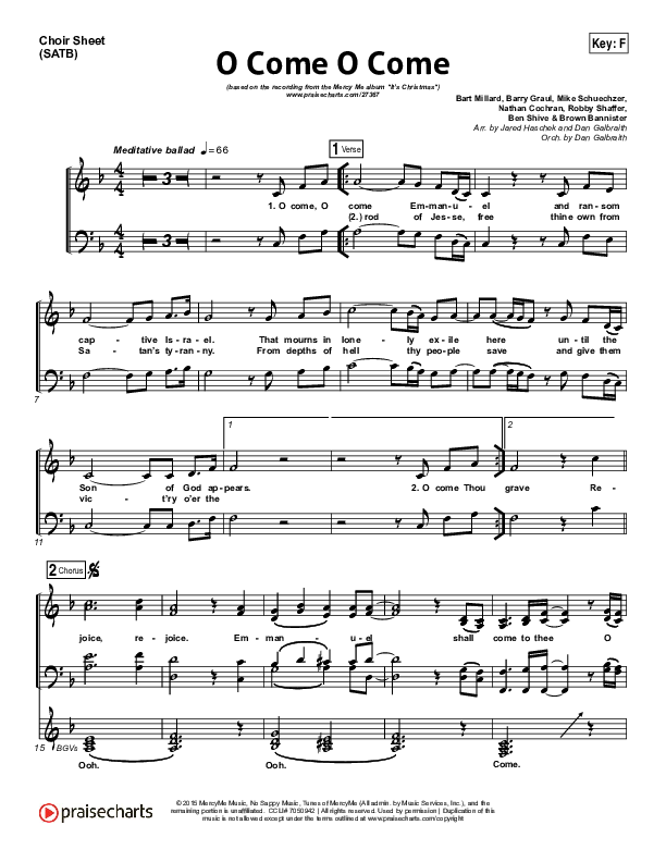 Download the Choir Sheet for O Come O Come by MercyMe, from the album It's Christmas. This song was arranged by Jared Haschek / Daniel Galbraith in the key of E, Eb, F, G.