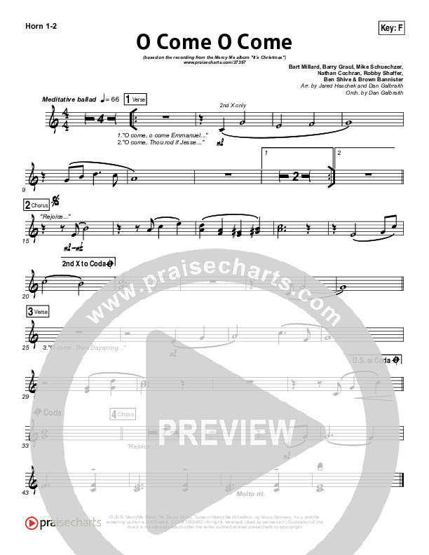 Download the French Horn sheet music for O Come O Come by MercyMe, from the album It's Christmas. This song was arranged by Jared Haschek / Daniel Galbraith in the key of E, Eb, F, G.