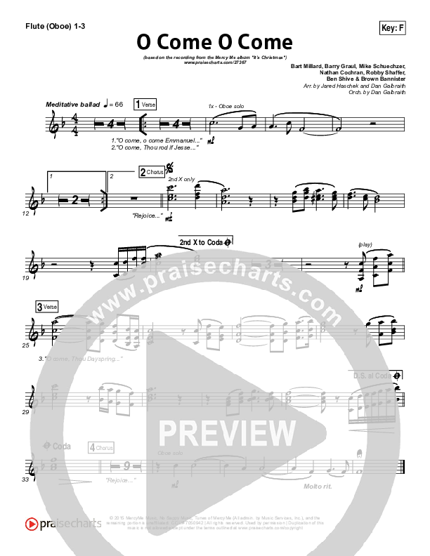 Download the Orchestration wind parts for O Come O Come by MercyMe, from the album It's Christmas. This song was arranged by Jared Haschek / Daniel Galbraith in the key of E, Eb, F, G.