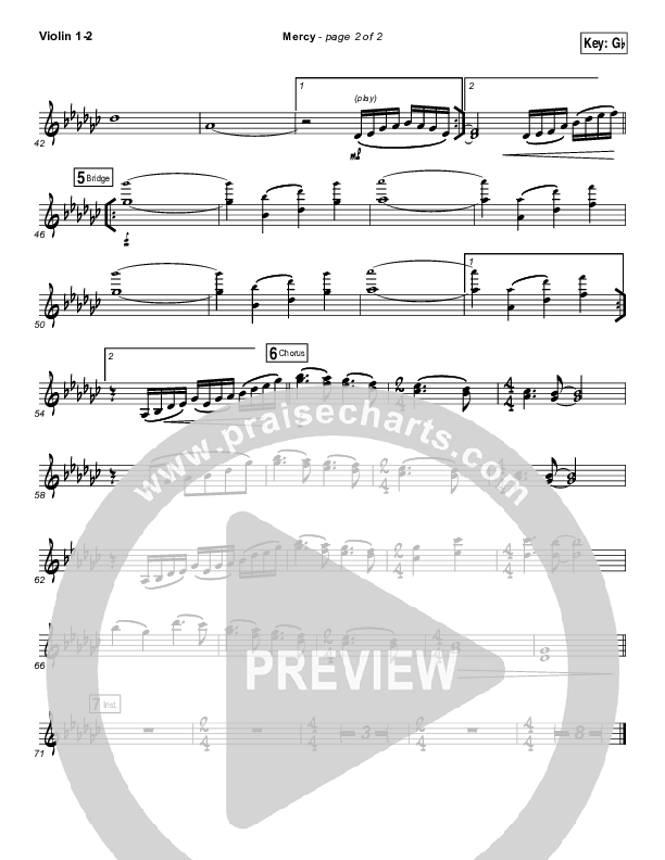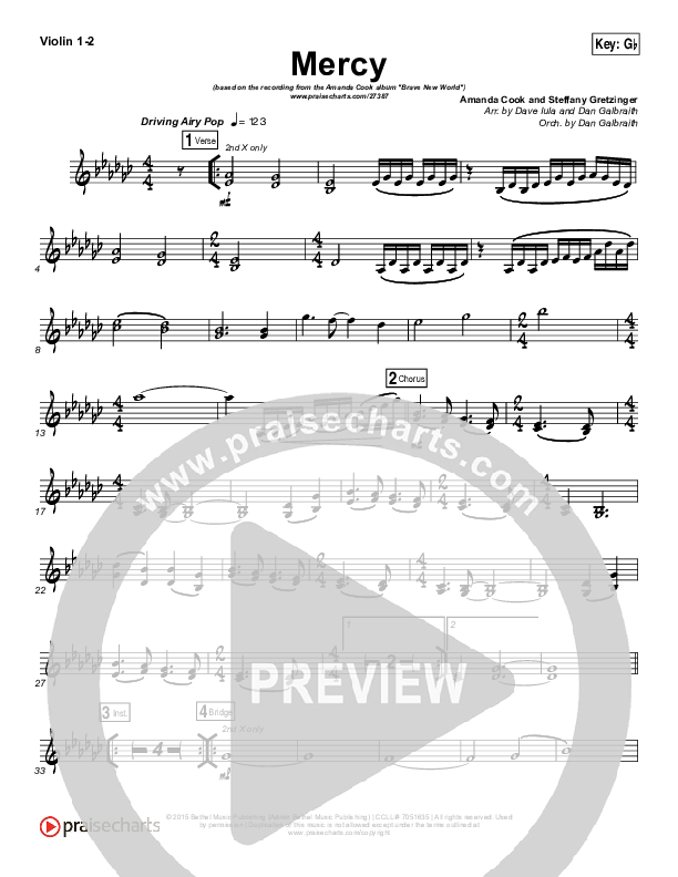 Download the Violin sheet music for Mercy by Amanda Lindsey Cook, from the album Brave New World. This song was arranged by Daniel Galbraith in the key of G, Gb.