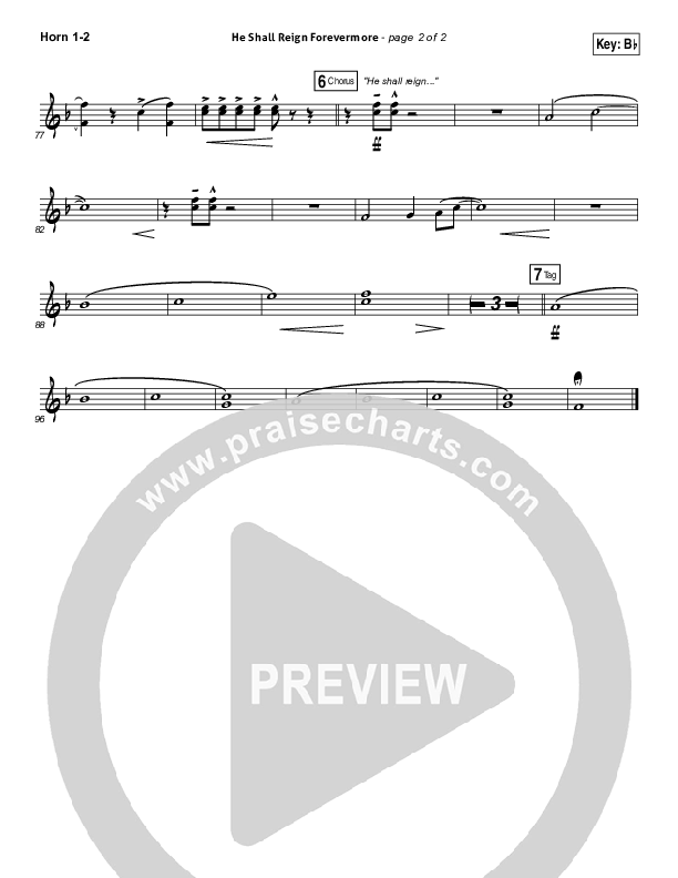 Download the French Horn sheet music for He Shall Reign Forevermore by Chris Tomlin, from the album Adore: Christmas Songs Of Worship. This song was arranged by Joel Mott in the key of A, Ab, B, Bb, C, Db, G.