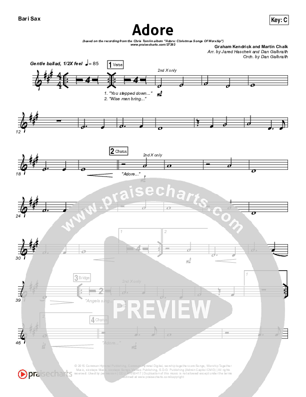 Download the Bari Sax sheet music for Adore by Chris Tomlin, from the album Adore: Christmas Songs Of Worship. This song was arranged by Jared Haschek / Daniel Galbraith in the key of A, B, Bb, C, D, Db, E, Eb, F.