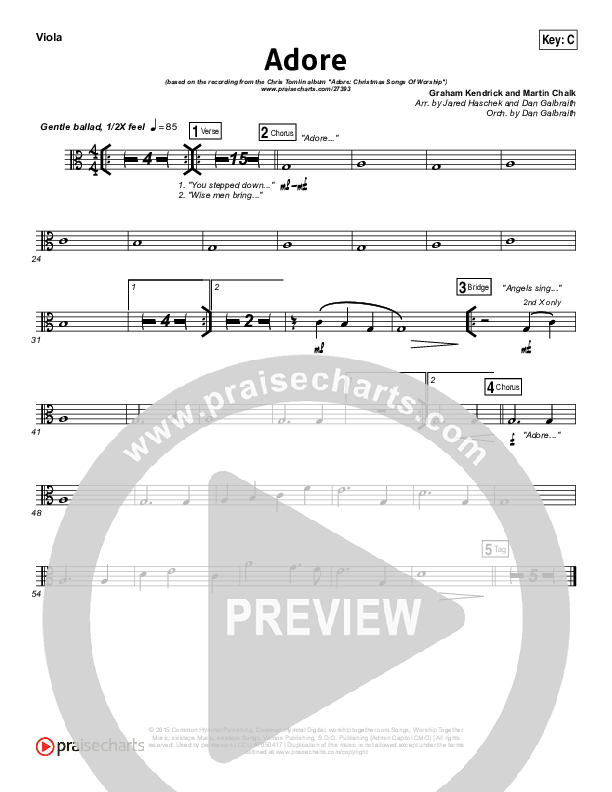 Download the Viola sheet music for Adore by Chris Tomlin, from the album Adore: Christmas Songs Of Worship. This song was arranged by Jared Haschek / Daniel Galbraith in the key of A, B, Bb, C, D, Db, E, Eb, F.