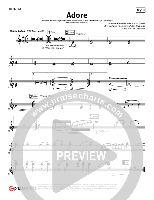Download the Violin sheet music for Adore by Chris Tomlin, from the album Adore: Christmas Songs Of Worship. This song was arranged by Jared Haschek / Daniel Galbraith in the key of A, B, Bb, C, D, Db, E, Eb, F.