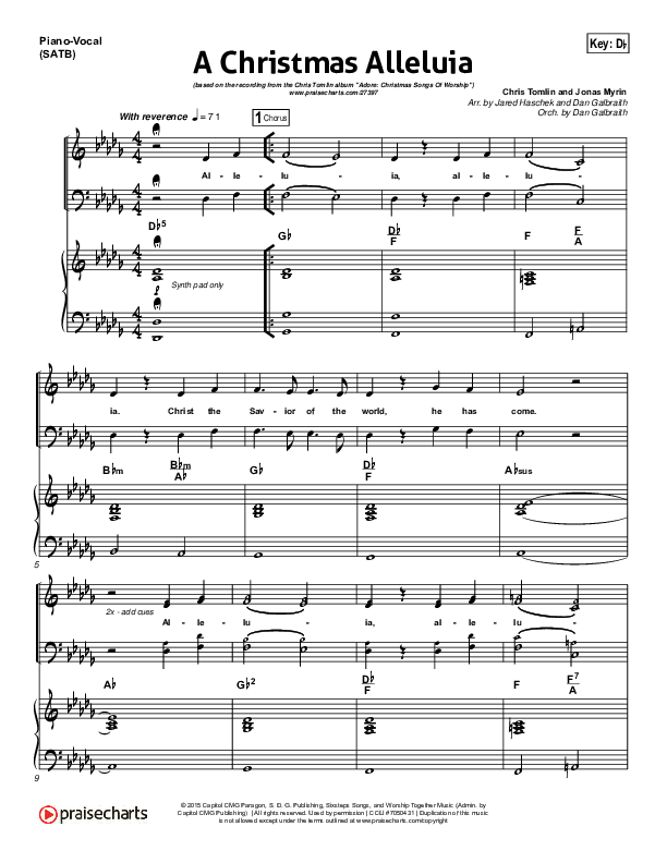 Download the sheet music for A Christmas Alleluia by Chris Tomlin / Lauren Daigle / Leslie Jordan, from the album Adore: Christmas Songs Of Worship. This song was arranged by Jared Haschek / Daniel Galbraith in the key of B, Bb, C, D, Db, E, Eb, F.