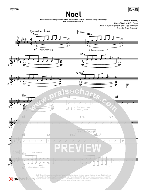 Download the Rhythm Chart for Noel by Lauren Daigle, from the album Adore: Christmas Songs Of Worship. This song was arranged by Daniel Galbraith / Jared Haschek in the key of Bb, C, D, Db, E, Eb, F, G.