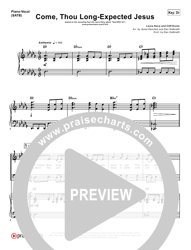 Download the Orchestration for Come Thou Long Expected Jesus by Laura Story, from the album God With Us. This song was arranged by Jared Haschek / Daniel Galbraith in the key of A, Ab, B, Bb, C, D, Db, Eb.