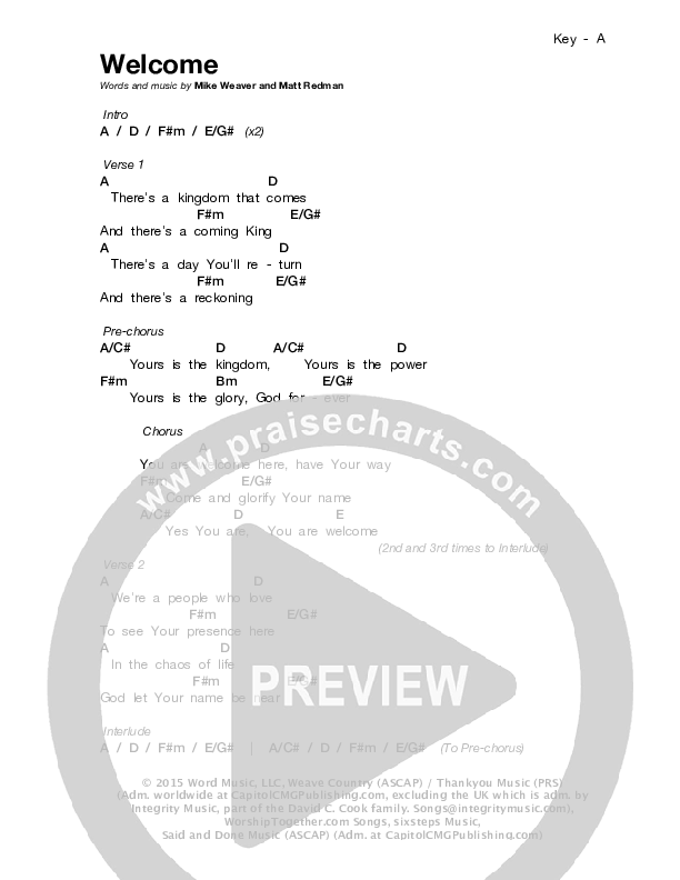 Download the PDF Chord Charts for Welcome by Big Daddy Weave, from the album Beautiful Offerings. This song was arranged by Word Music in the key of A.