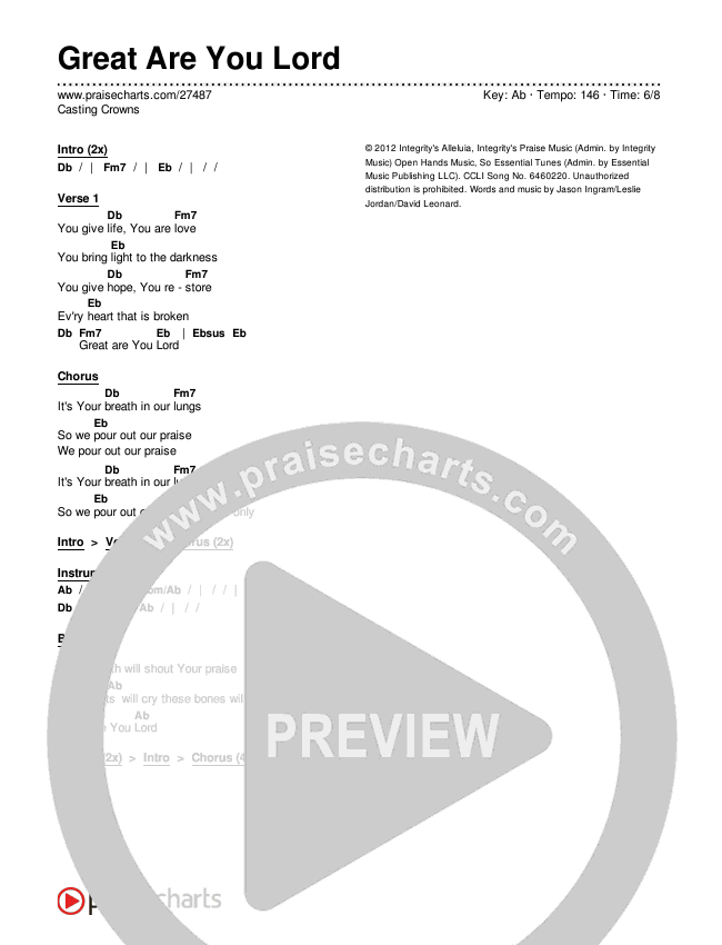 Download the PDF Chord Charts for Great Are You Lord by Casting Crowns, from the album A Live Worship Experience. This song was arranged by Dave Iula / Daniel Galbraith in the key of Ab, G.