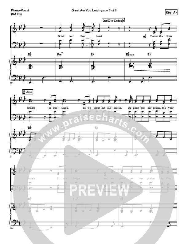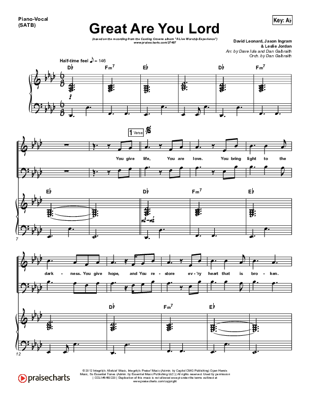 Download the sheet music for Great Are You Lord by Casting Crowns, from the album A Live Worship Experience. This song was arranged by Dave Iula / Daniel Galbraith in the key of Ab, G.