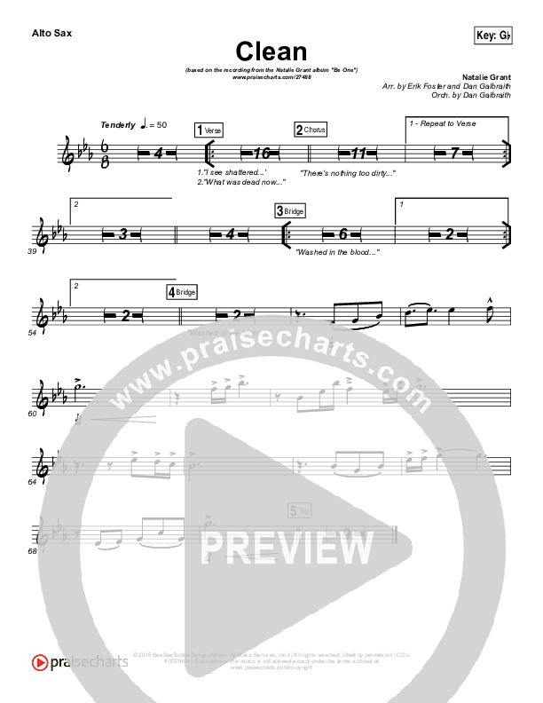 Download the AltoSax sheet music for Clean by Natalie Grant, from the album Be One. This song was arranged by Erik Foster / Daniel Galbraith in the key of A, Ab, Bb, E, F, G, Gb.